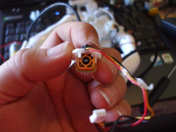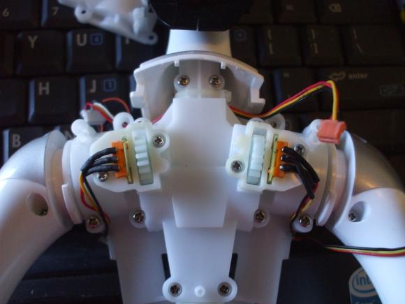 OK before you open up the gear system, remove the back plate here you will see 2 yellow VR's one for each side. remove 2 tiny screws that hold the plate on and remove the VR with the gear. If you look at the VR's center you'll see a white tab. Move the gear until the white tab is horizontal with the 3 wires. At this time just let the arms hang down to their side and carefully re install the VR. Do this to both sides. After that attach the back plate and turn her on. This will realign her settings back to where they should be. If the white tab does not move when you move the gear then the tab is broken and must be repaired.