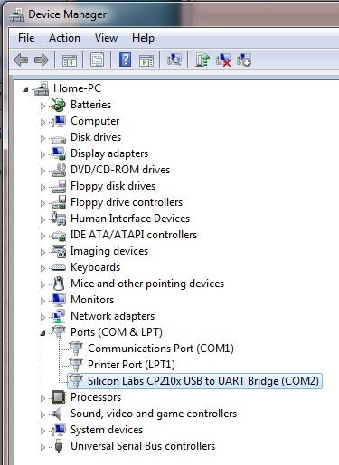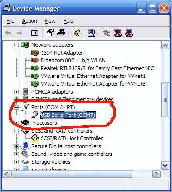 Now it's time to configure your communication program. I'm using HyperTerminal on WinXP, so you'll have to alter these instructions for your system. First, figure out what COM port your USB adaptor is on. Open the Device Manager and expand the Ports (COM and LPT) node: