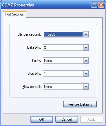 Set your port as shown above- 115200 baud, 8 bits, No parity, 1 Stop, Flow Control None.