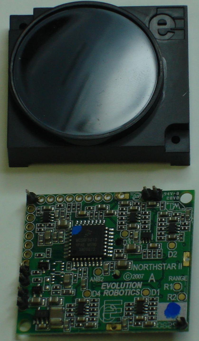 Additional photos: The NorthStar module is located at the top of the robot. The circular cover over the sensor array pops out of the plastic robot cover. The module is mounted on a board which connects to the main one over serial. Here's what it looks like inside.
