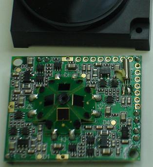 Top side of board with 3D pyramid shaped sensor (? and a pinhole camera in the middle ?)