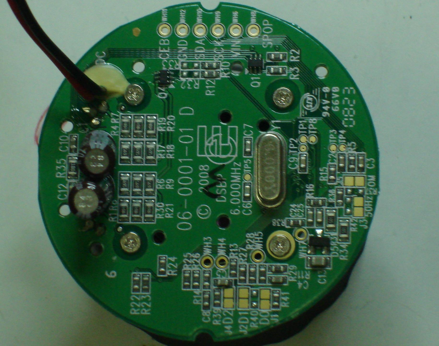 Top side of cover, bottom side of board (including Digital Signal Processor chip)