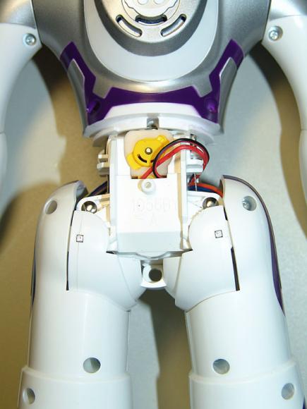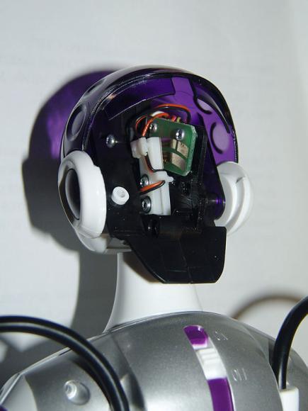 The motors are not step motors, but a simple "toy-class" DC electric motors. As I understand, when her CPU wants to move, say, her arm half-way up, it simply turns on arm motor and repeatedly poll the arm VR until it will return the value, associated with "arm half-way up" position. Then motor stops. That technology is common for almost all WowWee robots. And sometimes even simpler: each of the Roboquad's legs have instead of VR only one switch, which tells CPU that leg is in "default" position.
