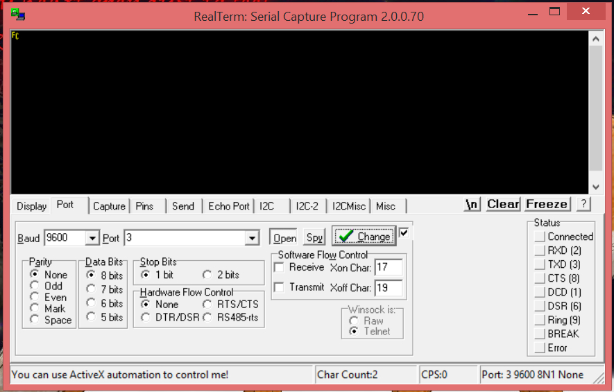 When this hack was completed, I plugged the chip into the USB port, and then opened realterm while the battery was disconnected. When I connected the battery to the dog, realterm shows this FC symbol, and I have no idea what it means even after extensively searching Google. Does anyone know what in the world this FC symbol means?